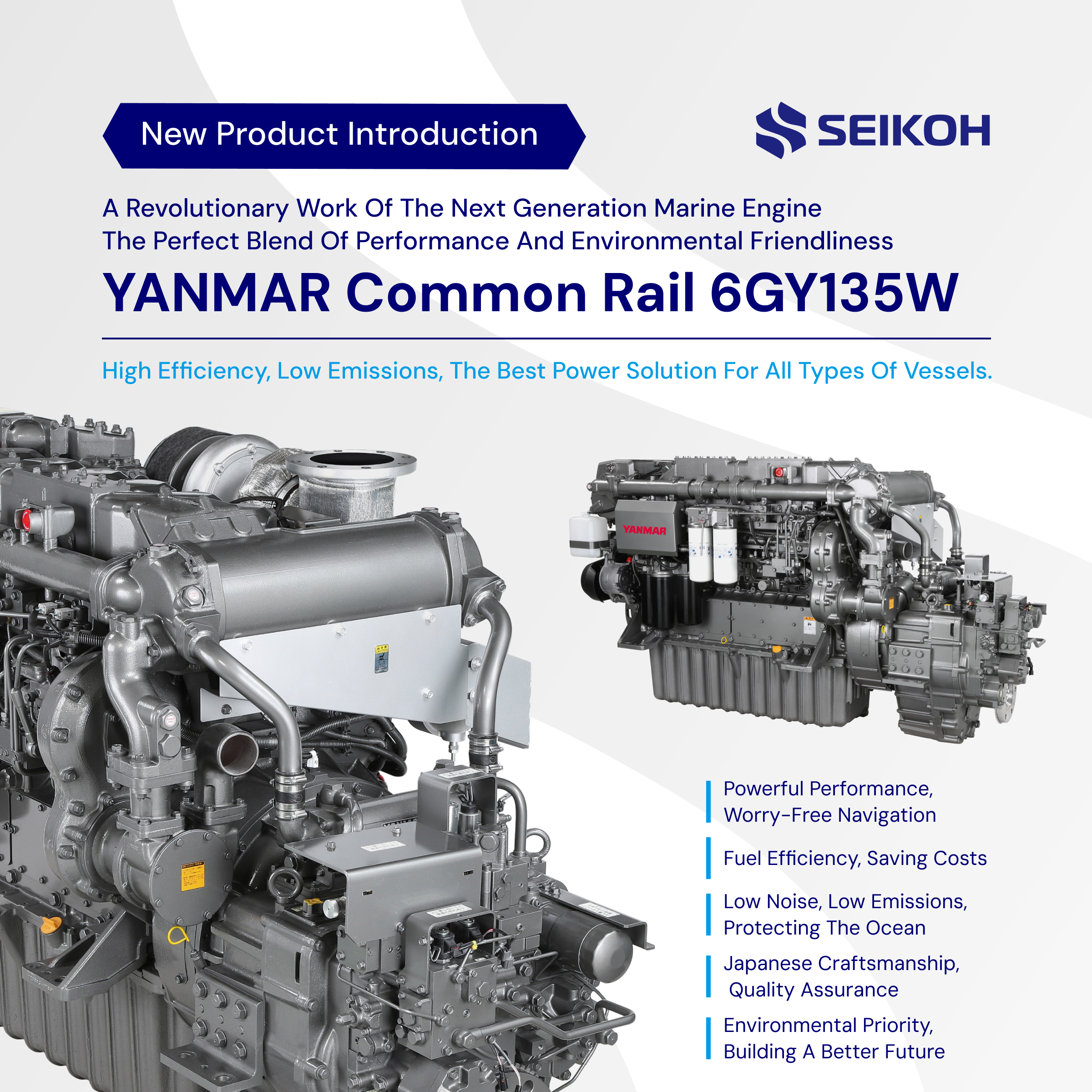Environmental Priority, Building a Better FutureThe Common Rail 6GY135W is a marine engine that combines powerful performance, fuel economy, low noise and emissions, and reliability and durability. Its excellent performance and versatility make it widely applicable to various vessel types, including fishing boats, ferries, commercial vessels, and luxury yachts. Whether it's nearshore fishing or ocean voyages, the 6GY135W can provide reliable power support, offering ship owners an efficient, reliable, and environmentally friendly power choice. Seikoh, as YANMAR's general agent in Taiwan, adheres to the service philosophy of "integrity, innovation, and customer first," and is committed to providing high-quality products and professional services.