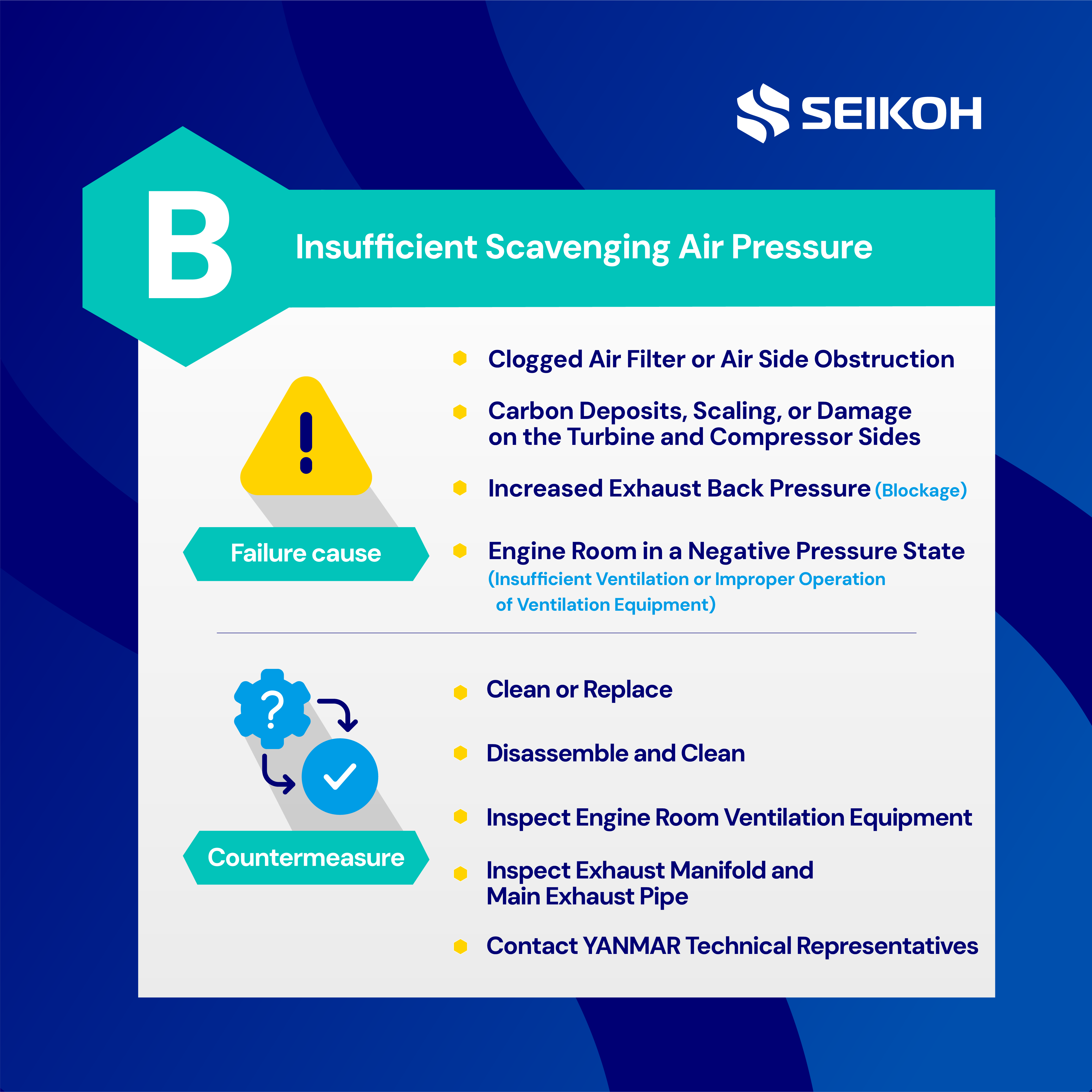 Scavenging is a crucial process in the operation of two-stroke (and four-stroke) engines. It is responsible for expelling the combusted exhaust gas from the cylinders and charging fresh air for the next combustion cycle. Scavenging efficiency directly affects engine power, fuel efficiency, and emissions. Therefore, both excessively high scavenging air temperature and excessively low pressure are issues that require immediate attention and resolution. In the following sections, we will provide a more in-depth analysis and explanation of the causes of failures and countermeasures you provided.