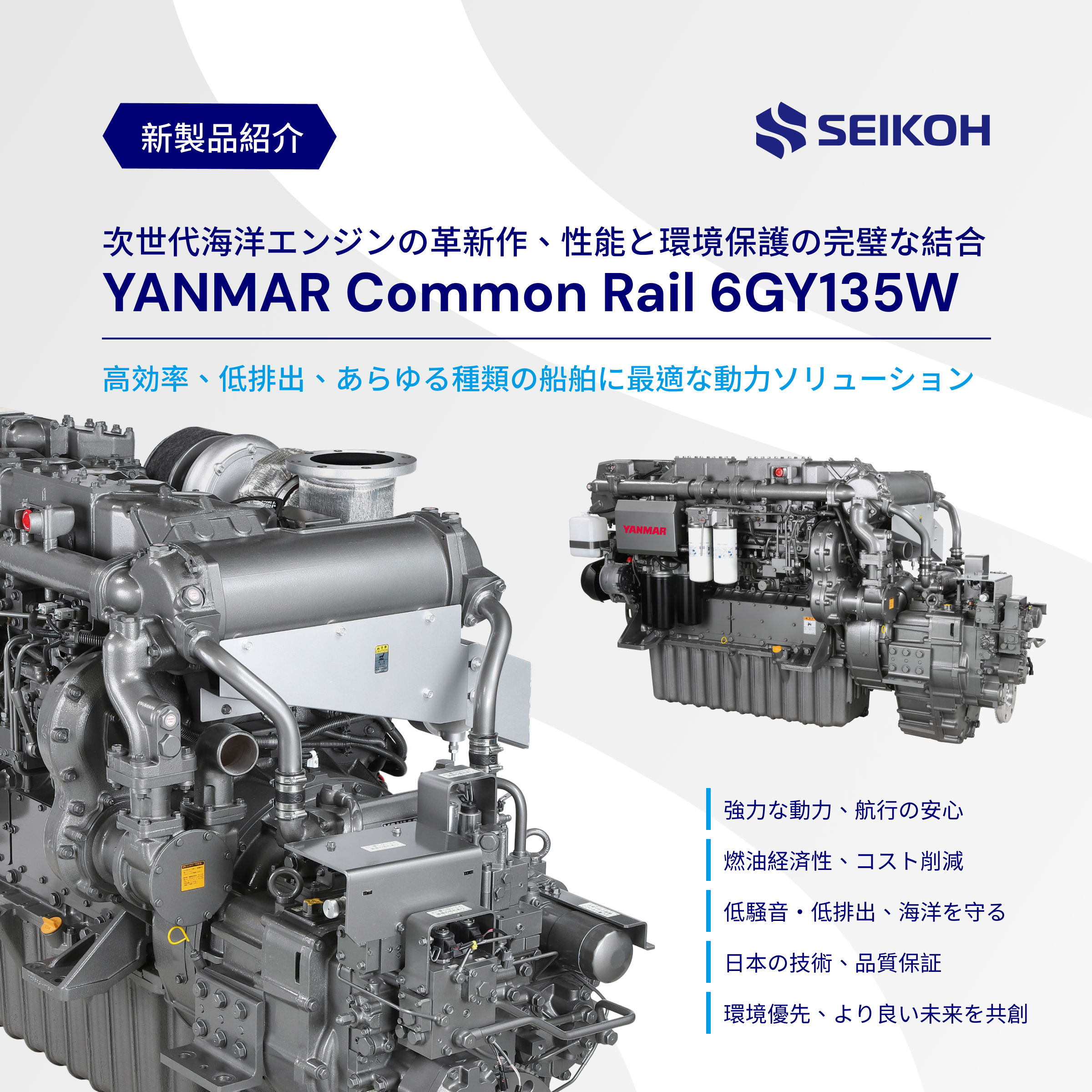 環境優先、より良い未来を共創Common Rail 6GY135Wは、強力な動力、燃料経済性、低騒音・低排出、信頼性の高い耐久性を兼ね備えた船用エンジンです。その優れた性能と多機能性により、漁船、フェリー、商船、豪華ヨットなど、さまざまな船種に広く適用できます。近海漁業から遠洋航海まで、6GY135Wは信頼性の高い動力サポートを提供し、幅広い船主に、高効率で信頼性が高く、環境に優しい動力ソリューションを提供します。Seikoh成高は、YANMARの台湾における総代理店として、「誠実、革新、顧客第一」のサービス理念を掲げ、高品質な製品と専門的なサービスの提供に努めています。